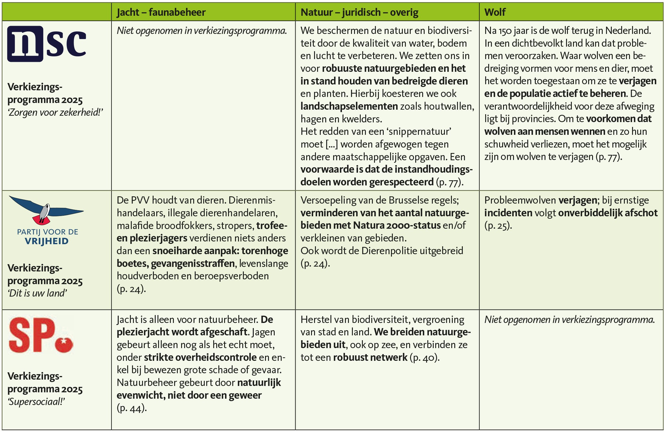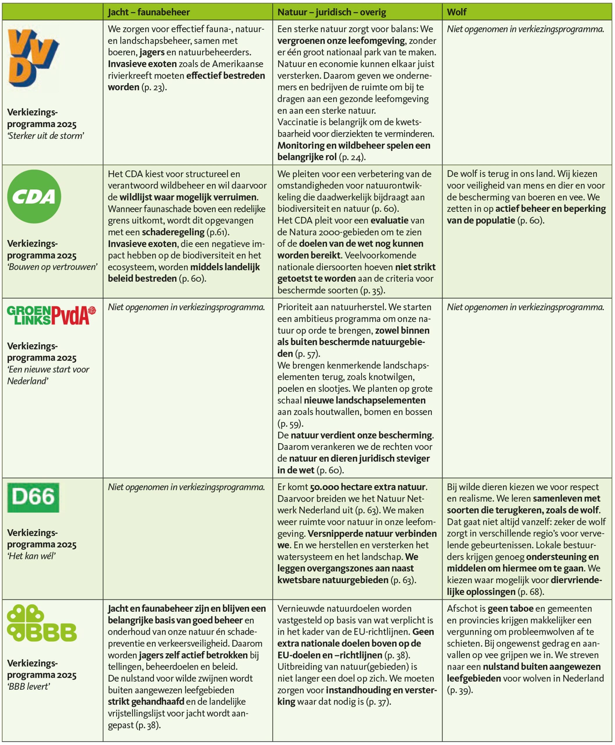 De aanstaande Tweede Kamerverkiezingen vinden vervroegd plaats, nadat in juni 2025 de PVV besloot uit de coalitie te stappen na onenigheid over asielmaatregelen. Sindsdien opereert het kabinet als demissionair minderheidskabinet. In augustus van dit jaar verlieten ook alle NSC-bewindslieden de regering. Daarmee zat kabinet-Schoof slechts 337 dagen, na een formatie van 223 dagen. Er valt straks op de 29e veel te kiezen: in de polls gaan verschillende partijen nek-aan-nek. Hoe kijken de partijen tegen jacht en natuurbeheer aan? Wij maakten een rondje langs de velden en doken de verkiezingsprogramma’s in. Hieronder treft u een overzicht, waarin de partijstandpunten overzichtelijk op een rij zijn gezet. We bekeken wat de partijen over de volgende drie relevante onderwerpen schrijven: