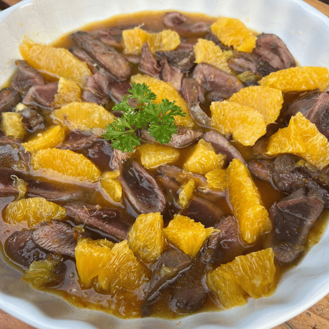 Een klassiek wildgerecht waarin sappige eendenborst wordt gecombineerd met een friszoete saus van sinaasappel, citroen en Grand Marnier. De karamelliserende saus geeft de eend een volle, luxe smaak — perfect voor feestelijke gelegenheden.