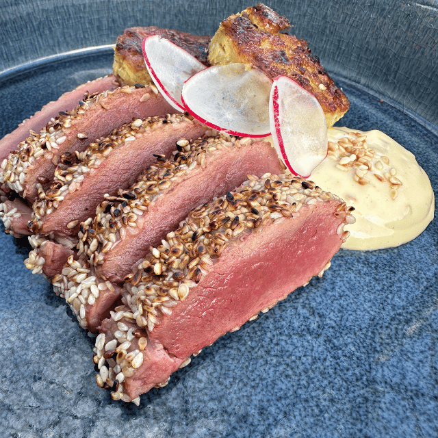 Een verfijnde Aziatisch geïnspireerde bereiding van reerugfilet, kort gebakken met een korst van sesamzaad. Geserveerd met krokante koolfritters en romige sesam-mayonaise — een perfect gerecht voor jagers met geduld én smaak.